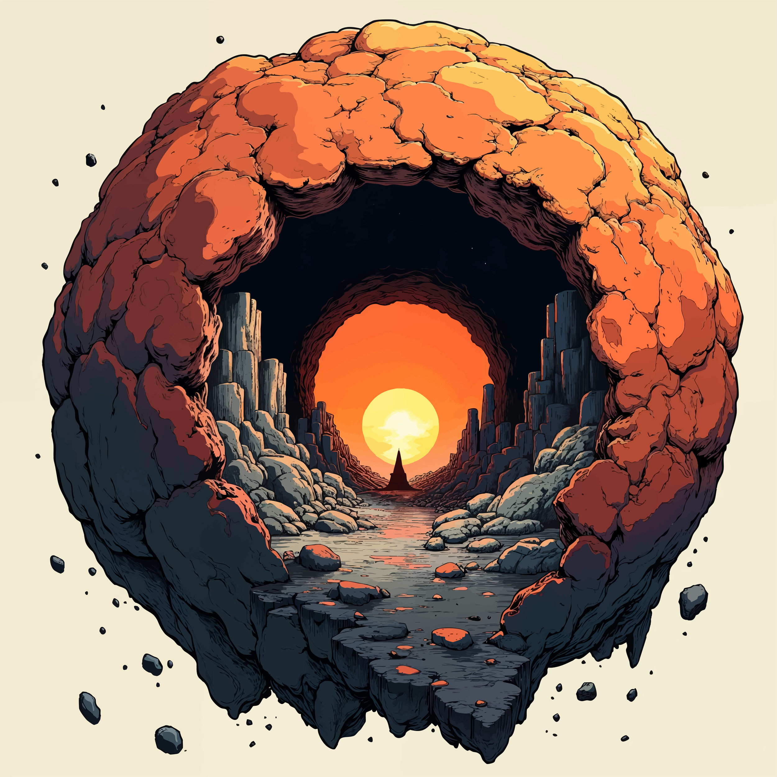 A crumbling celestial shell encircles a glowing sunset path, where rocky formations lead toward a distant peak and the blazing orb of light. The piece evokes cosmic isolation and ancient mystery, blending fantasy and sci-fi vibes. Ideal for surreal art collectors, dreamscape enthusiasts, and bold interior decor.